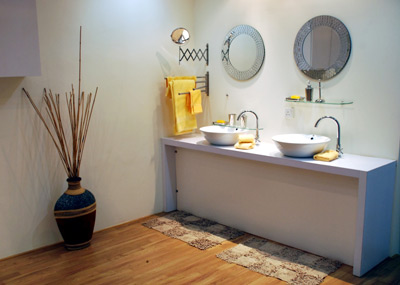 varianta 2 Copiii tai vor fi foarte incantati sa aibe baia lor. Decorata in nuante calde, poti inlocui gresia si faianta cu parchet si cu vopsea lavabila pentru suprafata peretilor. Doua chiuvete mici, intr-un design tineresc vor imprima voie buna si energie copiilor tai in fiecare dimineata.