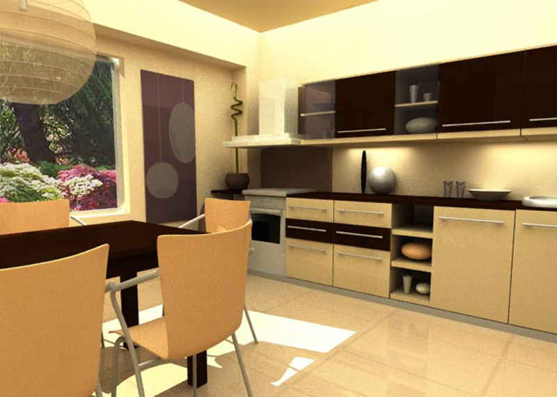 Amenajata la parterul locuintei, bucataria comunica cu exteriorul casei. Desi exista un dining destul de generos, gazdele nu au renuntat la inca un loc de servit masa in bucatarie. Masa si scaunele sunt ideale pentru servirea micului dejun intr-o atmosfera canda. Corpurile de mobilier sunt elegante si surprind prin jocul plin-gol al designului si prin nuantele contrastante.