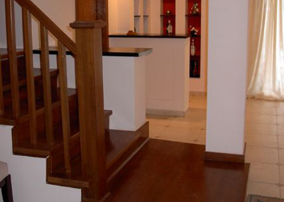 Scara, ce face legatura intre niveluri, este din beton armat si are treptele imbracate in lemn masiv. Eleganta si finisata la superlativ, aceasta a fost pozitionata intr-o zona retrasa a parterului cu scopul de a nu ocupa spatiul.