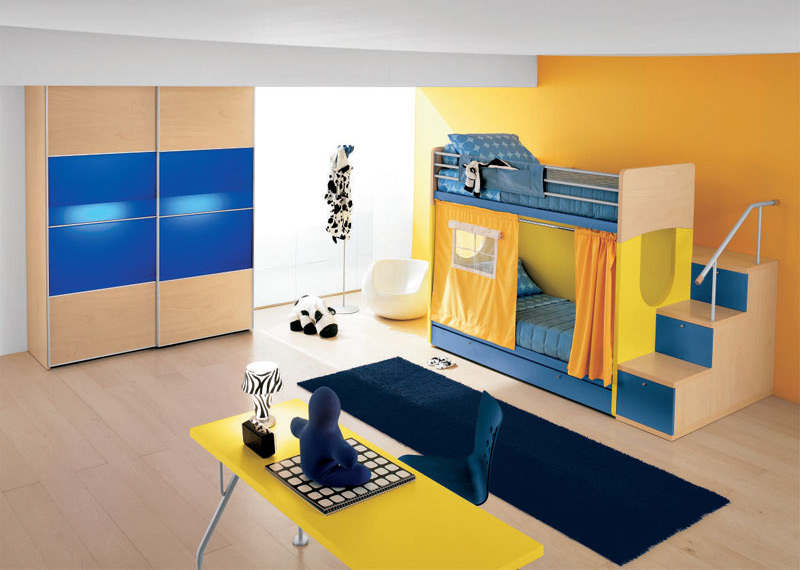Compozitie: Paturi supraetajate cu scari tip dulap, cu deschidere spre exterior. Paturile sunt dotate cu saltele ortopedice 22 cm � grosime, avand un sertar cu deschidere in exterior sub patul de jos. Dimensiuni: 203 x 135/145 x 174 cm. Dressing cu doua usi glisante, compartimentat. Dimensiuni: 182 x 65 x 230 cm. Birou cu picioare metalice si scaun. Pret in functie de finisaje. INTERIOR STORE