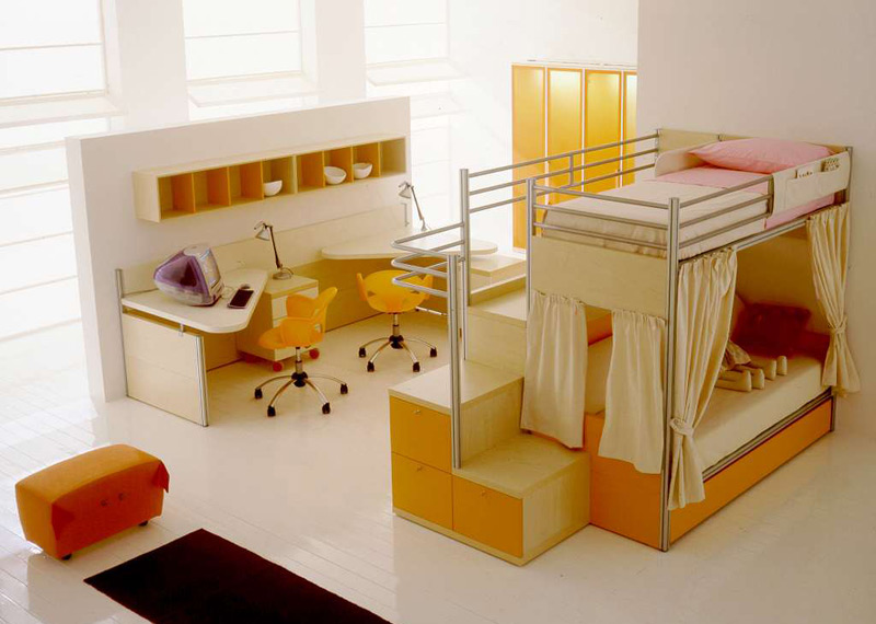 Compozitie: Paturi supraetajate cu scari tip sertare, cu deschidere in exterior. Paturile sunt dotate cu un sertar inferior cu deschidere in exterior. Birouri cu dulapuri pentru depozitare si scaune birou. Cuburi suspendate pe perete. Dressing cu patru usi semi-transparente, compartimentat interior. Pret in functie de dimensiuni si finisaje. INTERIOR STORE