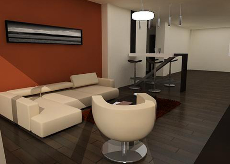 Alb, negru si caramiziu. Combinatie mai putin intalnita in locuintele noastre. Peretele caramiziu ofera un aspect estetic aparte, acesta completand decorul. Piesele de mobilier au fost alese in stil minimalist, fiind definite de eleganta si linii simple. Livingul imprima o imagine sobra, aceasta datorandu-se finisajelor si simplitatii decorului. Knox Design