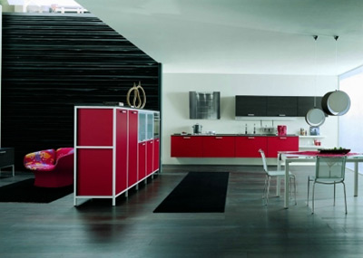 Un mobilier ideal pentru bucatariile deschise, cu finisaje negru – rosu lucios. Compozitie: blat de lucru format din dulapuri suspendate cu plita si lavoar incastrate, dulapuri suspendate pe perete, hota, dulap compartimentare cu sertare pe diferite dimensiuni, masa dinning si scaune. Pret in functie de dimensiuni si finisaje. INTERIOR STORE
