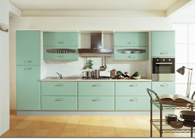 Bucataria cu fronturi din Mdf, cu acoperire polimerica, structura realizata din panouri aglomerate din lemn de grosime 18 mm. Blat melaminat si termorezistent de grosime 40 mm. Finisajul fronturilor poate fi: crem, cires, verde. Mobilier disponibil la comanda, pret pentru compozitie standard MOBEXPERT