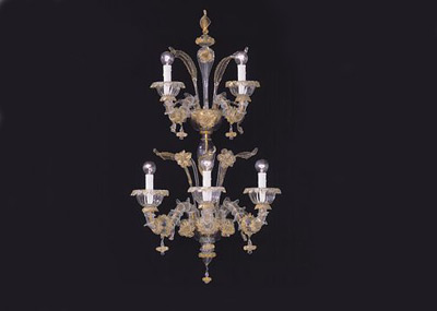 Candelabru realizat manual din sticla de Murano, cu finisaje ale sticlei crystal si decoratiuni aurii. Dimensiuni 100 h si 130 cm. Candelabrul este disponibil si pe alte dimensiuni. Preturi incepand de la: 1.500 euro + TVA. Produs in Italia. INTERIOR STORE
