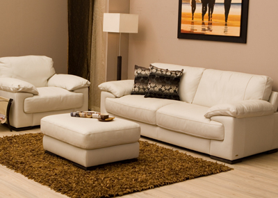 Canapea 3 locuri fixa cu tapiterie din piele, dimensiuni 238Lx98Ax88H cm, finisaj fiumicino alb, pret 5399 lei. Fotoliu cu tapiterie din piele, dimensiuni 123Lx98Ax88H cm, finisaj fiumicino alb, pret 3599 lei. Taburet cu tapiterie din piele, dimensiuni 89Lx72Ax42H cm, finisaj fiumicino alb. MOBEXPERT