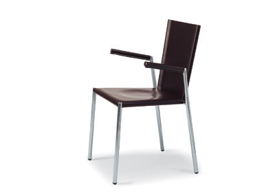 Scaun cu brate, cu structura metalica cromata si tapiterie din piele regenerata, finisaj maro sau negru. MOBEXPERT