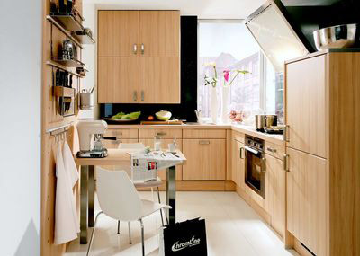 Stim foarte bine cat de greu este sa mobilezi bucataria unui apartament de bloc. Insa, un designer poate propune modelul ideal pentru orice spatiu. In imaginea de fata avem organizarea unui mobilier de bucatarie pe o suprafata modesta. Nuantele folosite ajuta la imaginea spatioasa oferita de designul mobilierului in cauza. Pentru a suplini toate spatiile de depozitare s-au realizat si cateva polite din sicla.