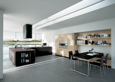 Contrastul cromatic ofera sobrietate si eleganta. Mobilierul realizat in linii drepte exprima degajarea unui spatiu deschis si generos, plin de nonconformism. Blatul de lucru, incastreaza atat chiuveta cat si cuptorul, este sub forma de L si a fost dotat cu sertare si rafturi pentru ascunderea ingredientelor si ustensilelor culinare. Locul de servit masa a fost pozitionat retras pentru a nu incurca circulatia. Bucatarie ideala pentru o locuinta generoasa!