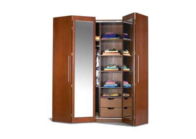 Dulap cu usi tip armonica, interior compartimentat cu rafturi, sertare si bara haine. Realizat din PAL 18, 22 mm furniruit cu furnir de fag, elemente din masiv de fag. Culoare maron si natur. Pret 2.050 lei. ELVILA