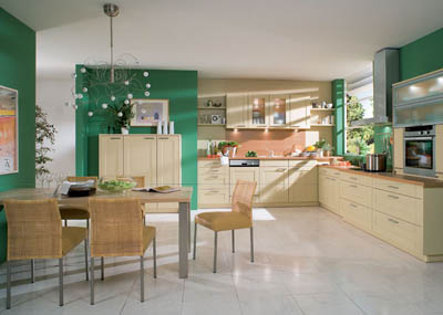 Si in decorul bucatariei avem foarte multe variante. O combinatie mai putin obisnuita este bejul si verdele. Imaginea ne prezinta un decor plin de primavara si de relaxare. Finisajele au fost alese cu grija, in nuante potrivite si din materiale de calitate. Daca te bucuri de un spatiu generos in bucatarie poti alege cu succes aceasta varianta de decor.