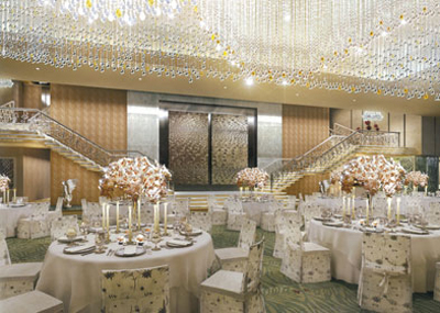 Cel mai interesant aspect al salonului de ceremonii il reprezinta cadelabrele de cristal, care acopera in proportie de aprox. 80% suprafata tavanului. Cele doua scari cu balustrade suflate in argint coboara chiar in zona de maxim interes a intregului decor, scena accesorizata cu un ecran de proiectie in spate, scena care va gazdui, fara indoiala, artisti si speakeri deopotriva.
