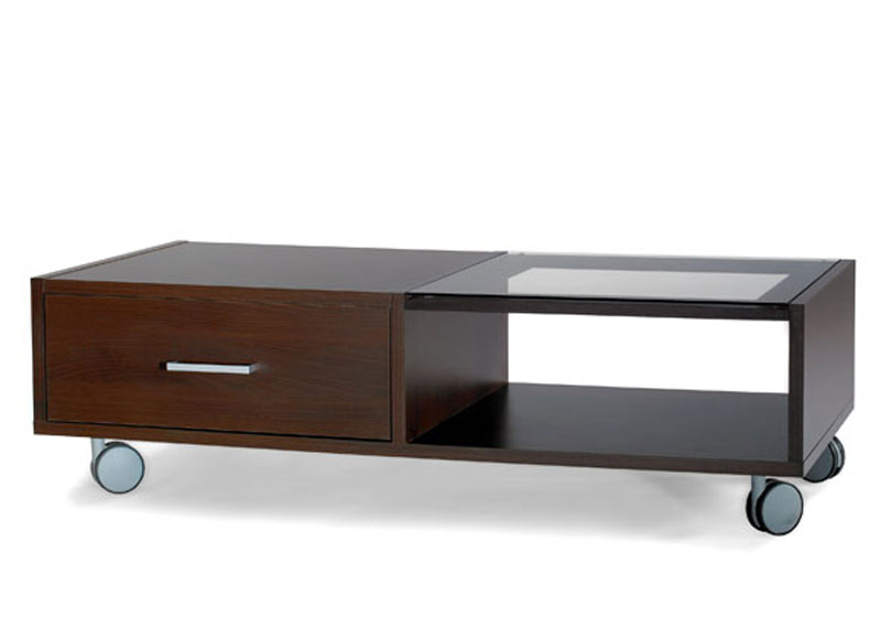 Masuta cu rotile si sertar, blat combinat sticla si PAL. Dimensiuni: L1230xA575xH375 mm. Materiale folosite: PAL furniruit cu stejar.Culori disponibile: Wenge Pret: 420 lei