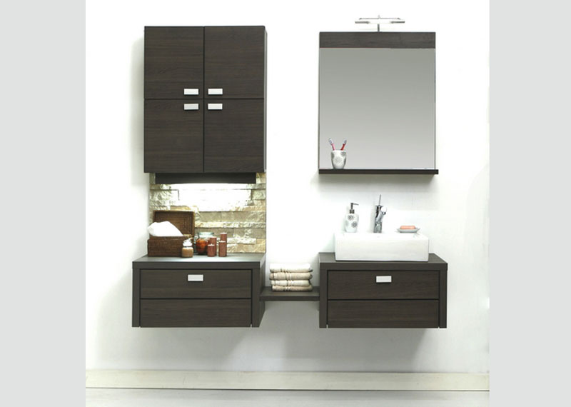 Mobilier modular de baie Maxi, realizat din panouri aglomerate din lemn melaminat, dim. 160Lx54Ax201H cm, finisaj wenge. Compozitie: Baza cu sertar si lavoar, dim. 65Lx54Ax34H cm, pret 1439 lei. Baza cu sertar, dim. 65Lx54Ax34H cm, pret 1129 lei. Polita intermediara, dim. 30Lx54Ax3H cm, pret 20,9 lei. Corp suspendat 4 usi cu panou piatra naturala si neon inclus, dim. 65Lx25Ax125H cm, pret 939 lei. Oglinda cu polite si spot, dim. 65Lx12Ax75H cm, pret 499 lei.