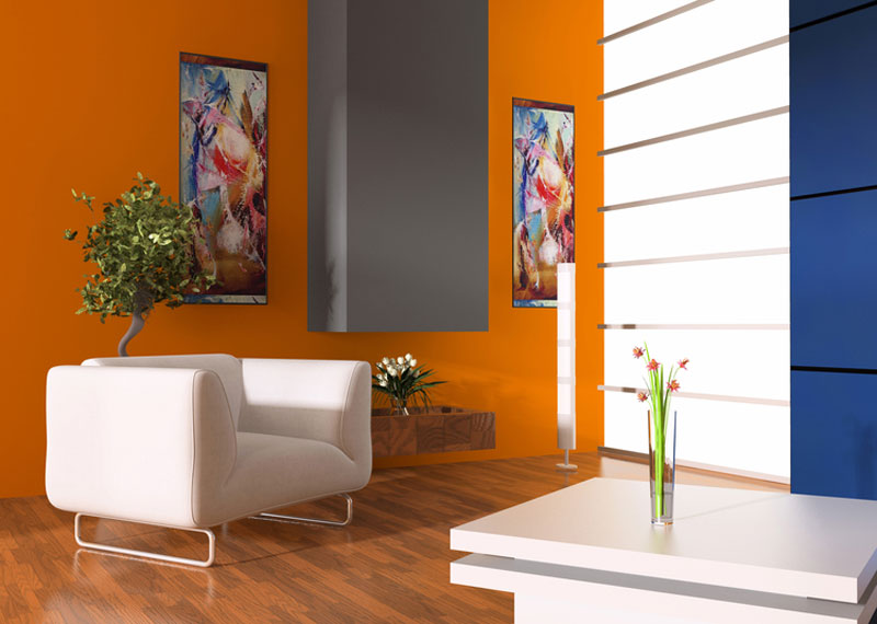 Spatiile in care domina tonurile de portocaliu sunt mai prietenoase, mai calduroase, motiv pentru care acestea se potrivesc foarte bine in living. Portocaliul este o culoare ludica, inspirand creativitate, imaginatie. Portocaliul se combina foarte reusit cu albastrul deoarece sunt culori complementare. Insa, acest lucru nu inseamna ca trebuie sa zugravesti un perete in albastru si restul in portocaliu. Incaperile colorate prea intens creeaza efecte copplesitoare si mai ales in spatiile mici ofera o imagine ingramadita. Cea mai buna varianta este sa alegi albastrul pentru unele piese mici de mobilier sau pentru covor.