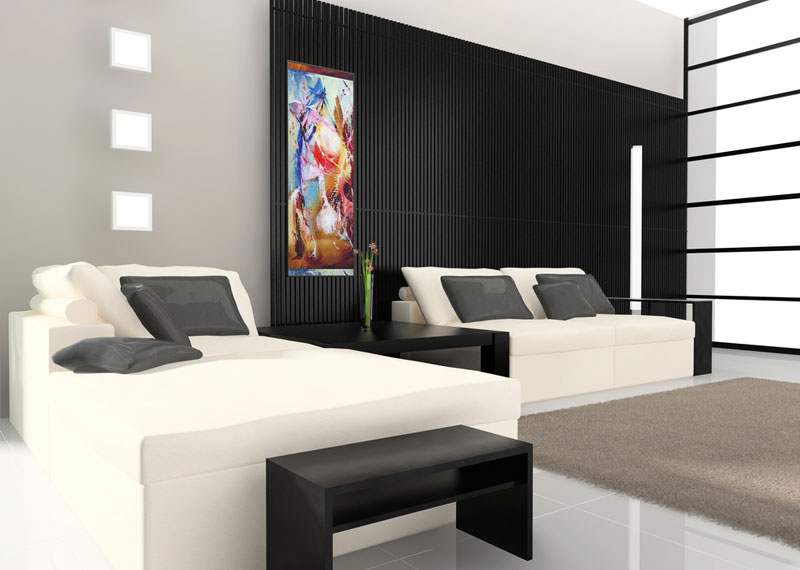 Foloseste covoare in nuante inchise daca peretii sunt zugraviti in alb. Nu trebuie sa zugravesti fiecare perete in aceeasi nuanta. Alege culori vii pentru un punct focal. Adauga obiecte de arta colorate, accente metalice si tesaturi cu imprimeuri moderne.