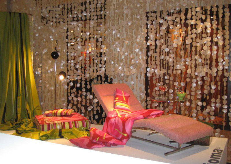 O combinatie de 5 materiale ideale pentru draperii, perdele si lenjerii de pat; cu diferite compozitii; si o perdea din cristale formeaza acest decor unic.