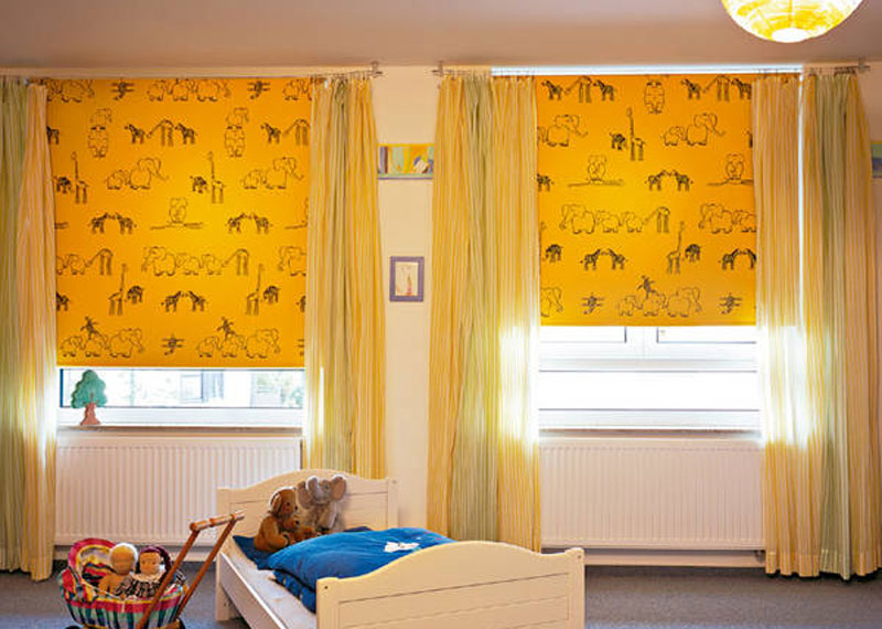 O perdea deosebita, alaturi de rulourile pentru ferestre creeaza o atmosfera ideala pentru camera copilului.