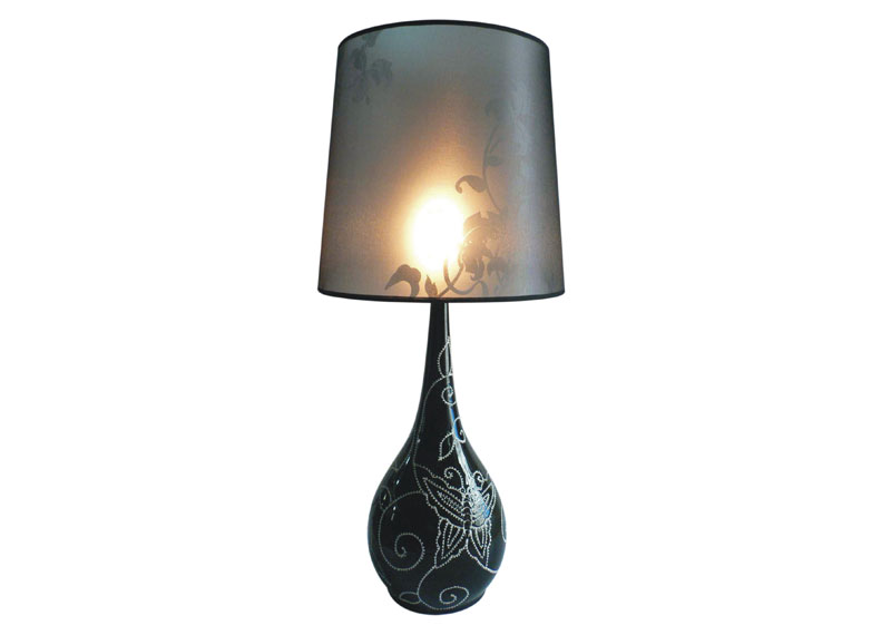 Veioza cu structura din ceramica si abajur din material textil.