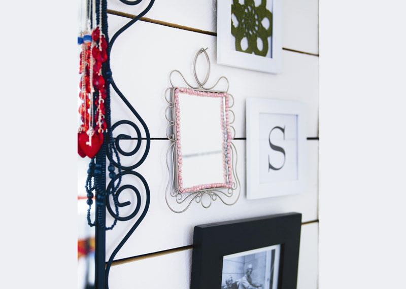 Oglinda de masa din sticla, rama din otel, cu perle roz.
