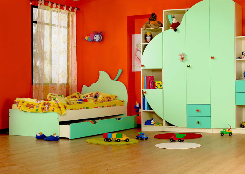 Pat o persoana cu sertar pentru depozitare, tablie pat si usi dulap sub forma de mar, dulap cu 3 tronsoane.