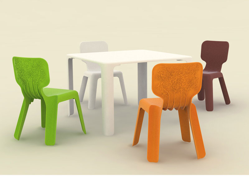 Masa si scaune stivuibile din polipropilena si fibra de sticla, pretabile utilizarii la exterior, top din MDF, grosime 20mm.
