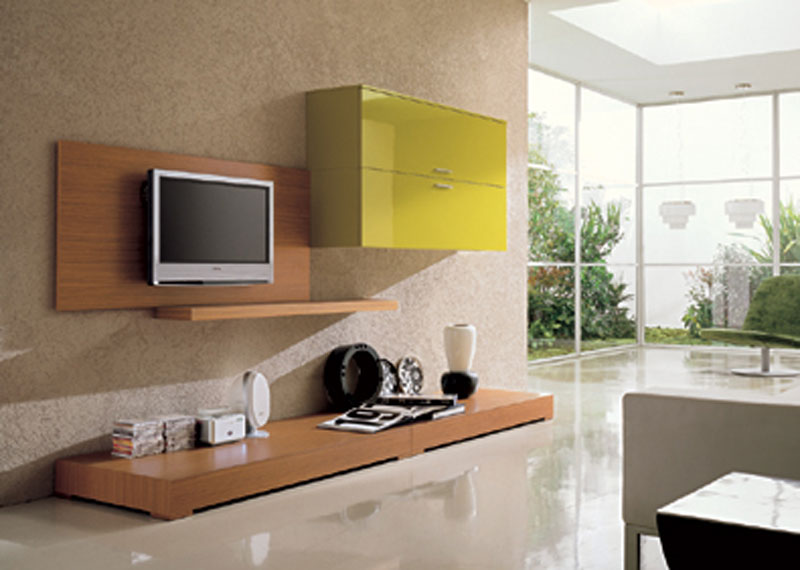 Compozitie formata din banca decorativa; dulap suspendat cu doua sertare, placa suport plasma si polita suspendata.