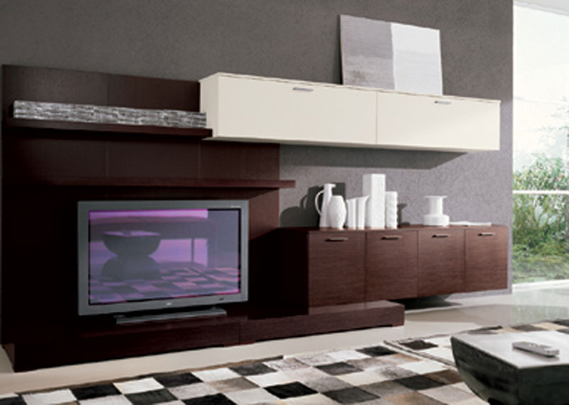 Compozitie formata din banca si comoda cu patru sertare; dulap suspendat cu doua sertare, placa din lemn furniruit - suport plasma; polite suspendate.