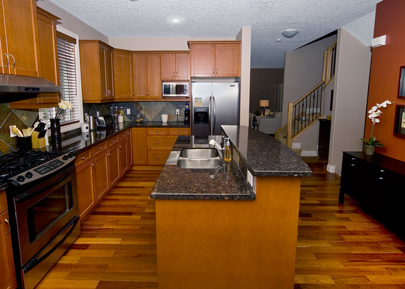 Bucataria este de dimensiuni foarte generoase. Proprietarul a optat pentru mobilier in stil clasic, dar functional in acelasi timp, datorita multitudinii spatiilor de depozitare.