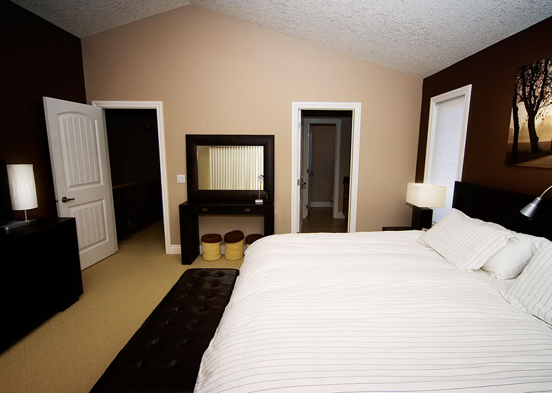 Dormitorul matrimonial este elaborat in jurul unui joc intre inchis si deschis, intre lumina si intuneric.