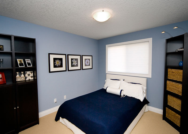 Incaperea de fata este amenajata intr-un mod foarte simplu, insa cu bun gust. Singurele elemente care sunt prezente in acest spatiu sunt cele strict functionale, precum patul, un dulapior si cateva rafturi de depozitare. Totusi, pentru a face spatiul primitor, nu lipsesc elementele decorative, precum fotografiile inramate si cosurile din ratan.