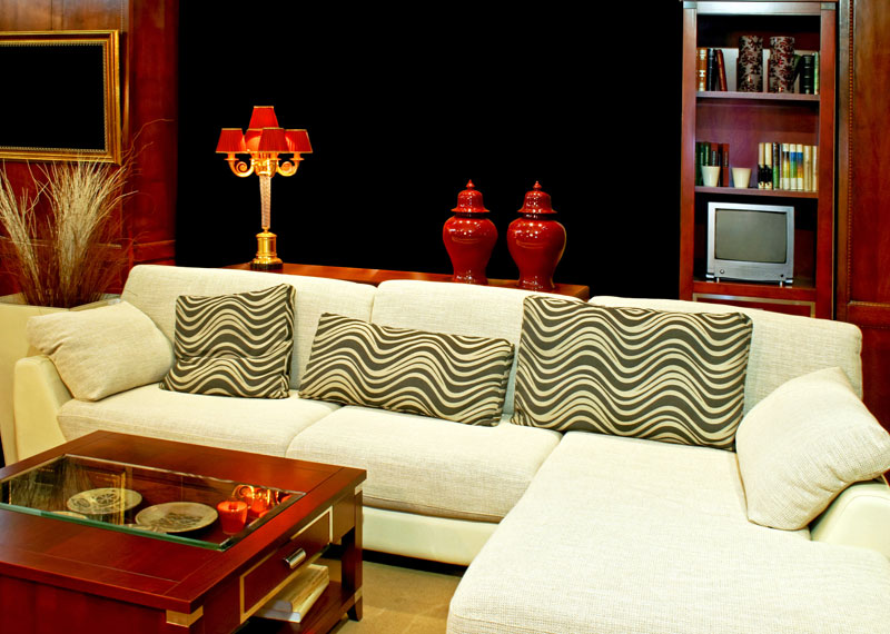 Modelul de amenajare prezentat este unul reusit deoarece canapeaua alb-gri contrasteaza cu tonurile calde ale pieselor de mobilier si accesoriilor, reusindu-se evitarea unui interior intunecat.