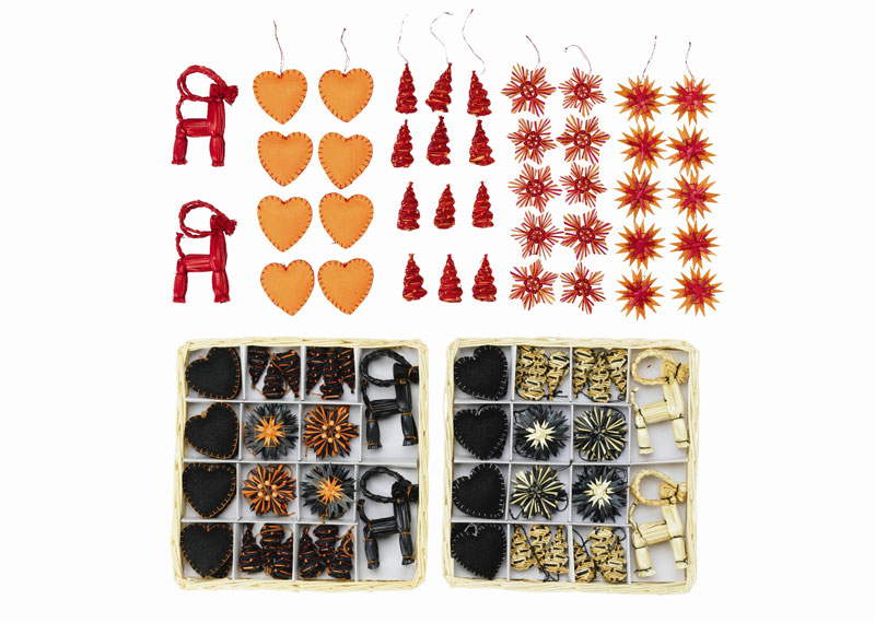 Cuprinde: 8 inimi (6x6x0,5 cm), 2 caprite din pai (inaltime 11 cm), 12 conuri (inaltime 5 cm) si 20 stele (diam. 5 cm).