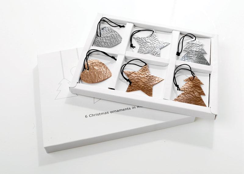 Ornamente de Craciun disponibile in cutii cu cate 6 bucati, aluminiu/cupru.