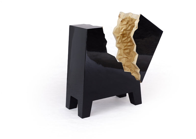 Piesa de mobilier "Ehrfurcht" se inspira din natura dura si imprevizibila a Alpilor fiind arhaica si greoaie prin design.