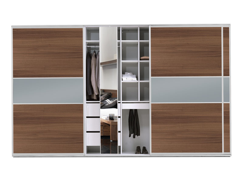 Dressing cu usa culisanta, furnir nuc / sticla aspect sablat, fara echipament interior.