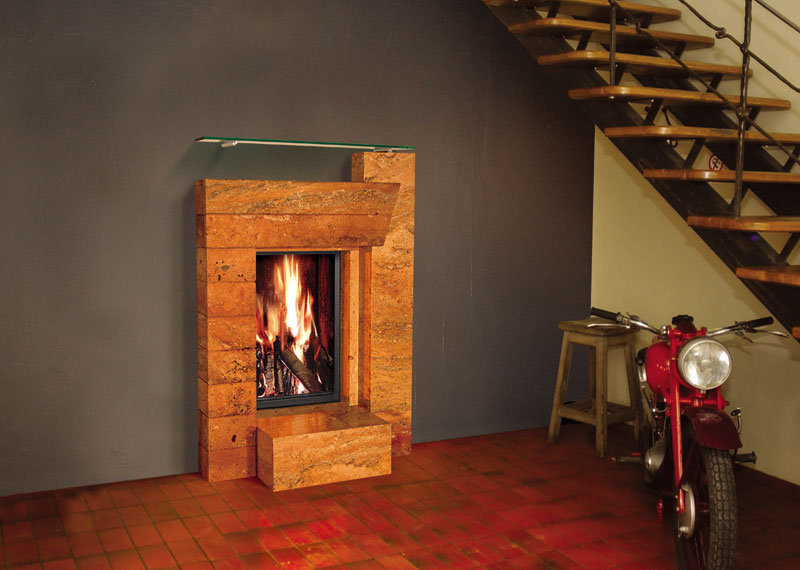 Semineu modern realizat din marmura Travertin anticata si sticla.