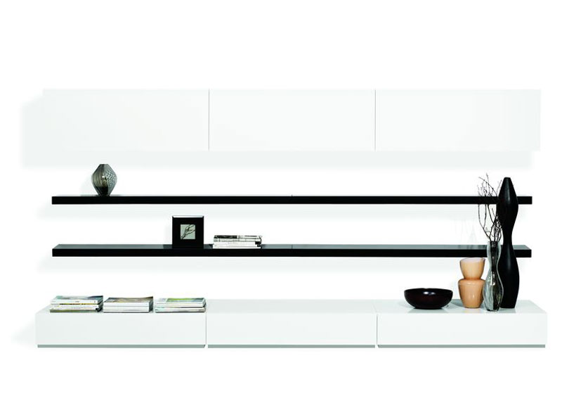 Sistem de perete Volani, baza si modul superior alb lacuit, polite de perete furnir stejar negru.