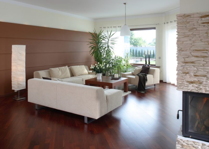 Imaginea alaturata prezinta un living modern de dimensiuni generoase. Dupa cum s-a putut observa si in celelalte modele de amenajari, stilul modern utilizeaza o serie de contraste. Avand in vedere nuanta inchisa a pardoselii si peretilor, pentru a evita o imagine apasatoare s-a optat pentru mobilier alb. De asemenea, ferestrele largi, prevazute cu perdele vaporoase, permit patrunderea unei cantitati ridicate de lumina naturala, cu scopul de a obtine o imagine cat mai aerisita, iar plantele de interior ofera prospetime.