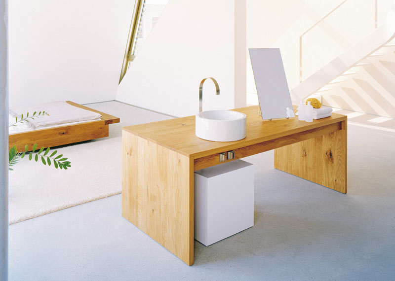 TOBA: Masca de chiuveta din lemn solid cu sau fara suport de instalare din lemn cu bare din aluminium, blat ceruit, rezistent la apa.