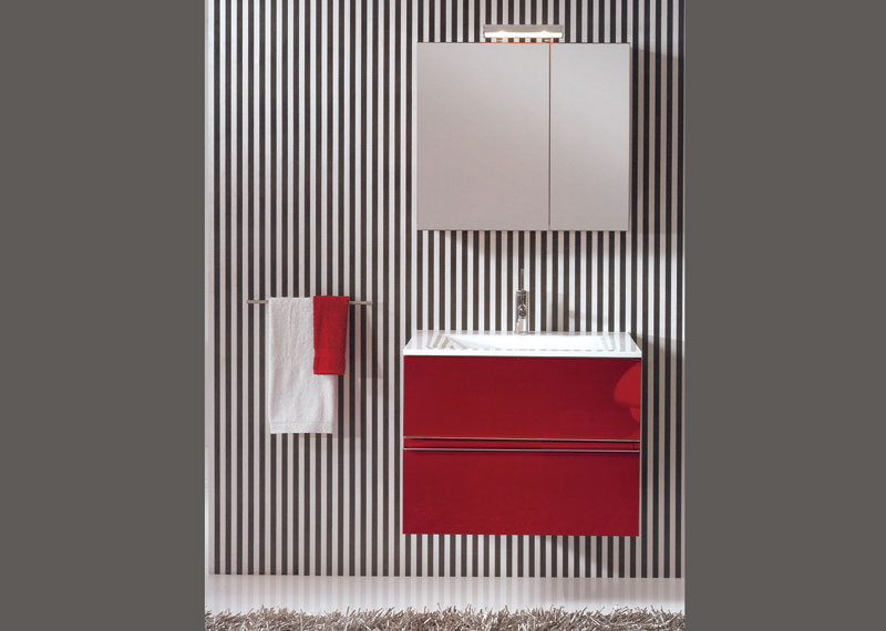 Mobilier de baie din MDF mat sau lacuit disponibil in variantele cromatice: lemn natur, lemn cenusiu, alb, bej, bordeaux.