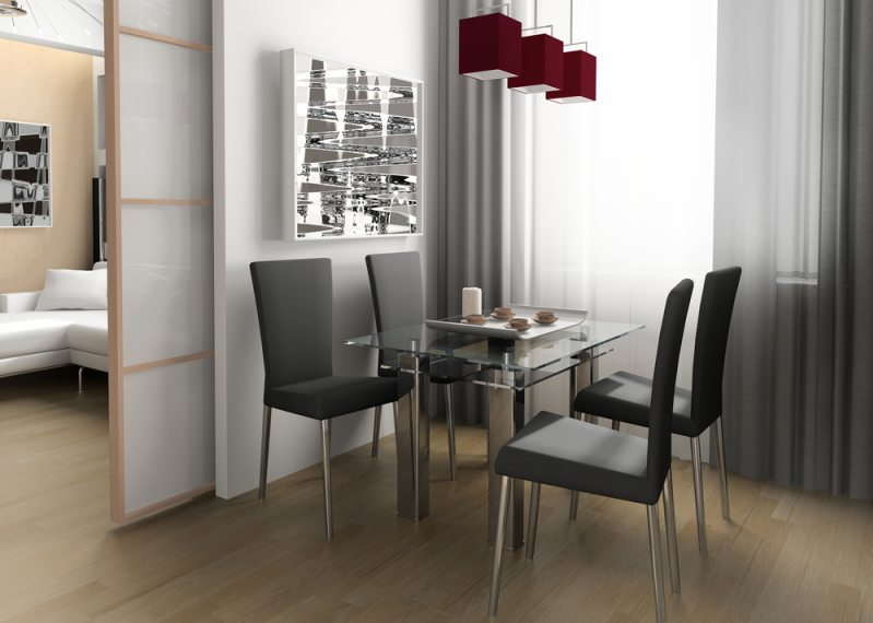 Imaginea alaturata prezinta o locuinta in care spatiile sufrageriei si livingului au fost separate printr-o astfel de solutie. Pentru o comunicare cat mai reusita intre cele doua spatii, pardoseala este neintrerupta. Astfel, atunci cand usa este deschisa, cele doua spatii devin unul singur.