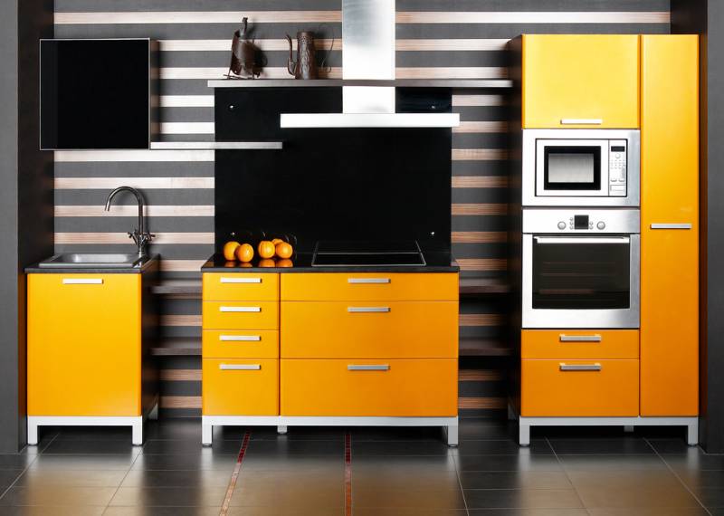 Iata o bucatarie nonconformista! Cromatica aleasa si dispunerea mobilierului nu sunt cele mai obisnuite pentru acest spatiu. Se cunoaste faptul ca portocaliul creste pofta de mancare, motiv pentru care aceasta culoare apare frecvent in bucatarii. Insa, ceea ce este neobisnuit in bucataria de fata este alaturarea acestei culori de tonuri foarte inchise. De regula, portocaliul se combina cu alb pentru a evita o imagine incarcata si apasatoare, dar pentru o imagine nonconformista se poate prelua si modelul de fata.