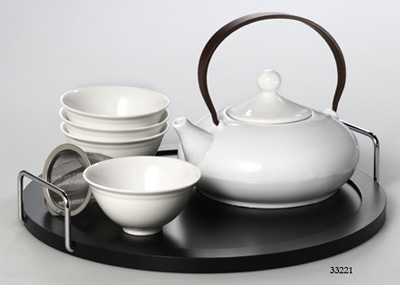 Set ceai pentru 4 persoane, compus din 8 piese (capac, ceainic, 4 ceşti, infuzor şi tava) din porţelan. Setul conţine şi o tavă cu ajutorul căreia poate fi transportat cu uşurinţă.