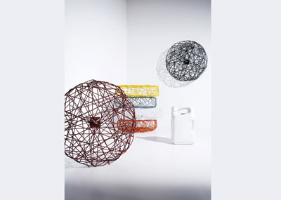 Ceas Ci vediamo - ceas de perete din retea de sarma lacuita, lucrat manual. Culori: negru, alb, galben, rosu, oranj, 50 cm diametru. Design: Antonino Sciortino, 2008. Pret: 138 EUR, fara TVA