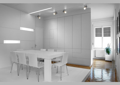 In cele ce urmeaza, va prezentam un proiect semnat Parasite Studio, proiect ce a fost nominalizat la Bienala de Arhitectura din anul 2008. Designul a fost conceput ca si o interventie, in care albul este dominant si joaca rolul unui mediu curat si imaculat, unde tema principala a apartamentului consta in dezvoltarea mobilierului tratat ca si o insertie contemporara unitara. Designul surprinde prin latura sa functionala si, in acelasi timp, estetica, fiind un exemplu de amenajare contemporana nonconformista si spectaculoasa.