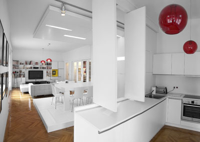 In cele ce urmeaza, va prezentam un proiect semnat Parasite Studio, proiect ce a fost nominalizat la Bienala de Arhitectura din anul 2008. Designul a fost conceput ca si o interventie, in care albul este dominant si joaca rolul unui mediu curat si imaculat, unde tema principala a apartamentului consta in dezvoltarea mobilierului tratat ca si o insertie contemporara unitara. Designul surprinde prin latura sa functionala si, in acelasi timp, estetica, fiind un exemplu de amenajare contemporana nonconformista si spectaculoasa.