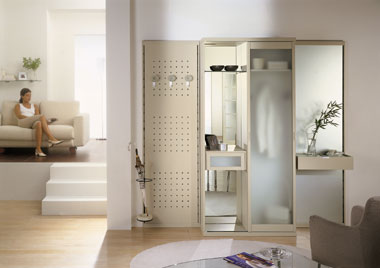 pentru holuri. Compozitia prezentata este realizata din lemn furniruit cu finisaje perlate; oferind multiple spatii de depozitare si o oglinda mare.