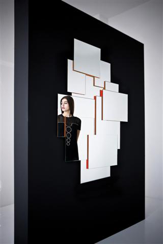 Pablo - placi de oglinda 5 mm grosime suprapuse putind fi montate pe orizontala sau verticala, folosind boracii/mecanisme cu clichet din otel prinse direct pe sticla. Dimensiuni: 106 x 148 cm. Design: Gabriela Rosa, 2008