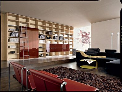 Modulo - Biblioteca cu polite si sertare cu usi lacuite lucios. Este un mobilier ideal pentru biblioteca sau biroul de acasa, oferind foarte multe spatii de depozitare, atat deschise, cat si inchise cu usi. Mobilierul este realizat din stejar, lemn lacuit lucios si oglinda lacuita. 543 x 48 x 268 cm